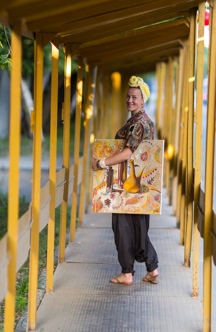 Вообще чередование глубины и плоскостности, декоративности и реалистичности в работах Олеси очень продуктивны — такая игра планов при насыщенном, откровенном цвете останавливает взгляд, делает изображение интересным для глаза. Вслед за художником зритель внимательно следит за развитием сюжета, чаще соглашаясь с акцентами, что расставляет автор в картине. Даже в чисто декоративных работах, где предмет и фон сливаются в одну плоскость, а различия в цветовых тонах минимальны, ритмическая организация силуэта, использование многих материалов (такая техника традиционно атрибутируется как смешанная) не оставляют разглядывающего равнодушным. Наверное, главным определением, применимым к автору, будет неравнодушие к рисованию. Олеся еще в начале пути, и формальные открытия в процессе освоения материала только переходят в ее опыт владения материалом, но через оригинальное применение своих умений она уже заявила о себе, как самобытном феномене. Одно хочется видеть — ее картины на стенах не как привлекательные декоративные пятна (всеохватывающий ужас современных интерьеров), но как ясные и содержательные изображения, призывающие к интригующему рассматриванию.
